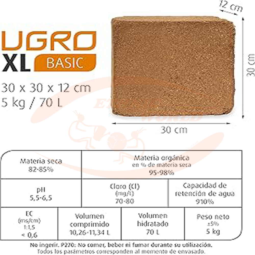 The U-Gro XL Basic 70 L block is a high-quality, compressed and dehydrated coconut growing medium. Once hydrated With approximately 18-28 liters of water, it transforms into ~70 liters of ready-to-use coco coir substrate, ideal for growing in pots or containers, both indoors and outdoors.This substrate is composed of Made of fine coconut particles (low fiber content) which ensure excellent root aeration, high water retention capacity, and a stable pH (= 5.5–6.5) suitable for growth and flowering cycles. It has been washed with soft water, buffered (true-buffered) and ready to use. usage.